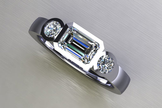 Three Stone Emerald Cut & Round Brilliant Cut Diamond Platinum Ring Design