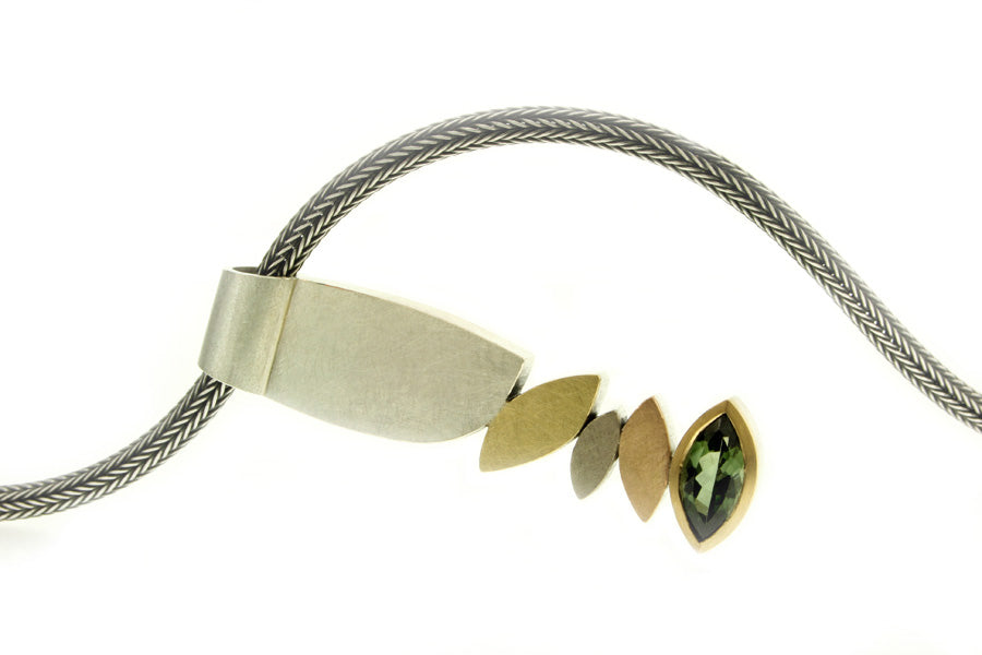 Contemporary handmade marquise design silver & 18ct coloured gold necklace set with a marquise green tourmaline.