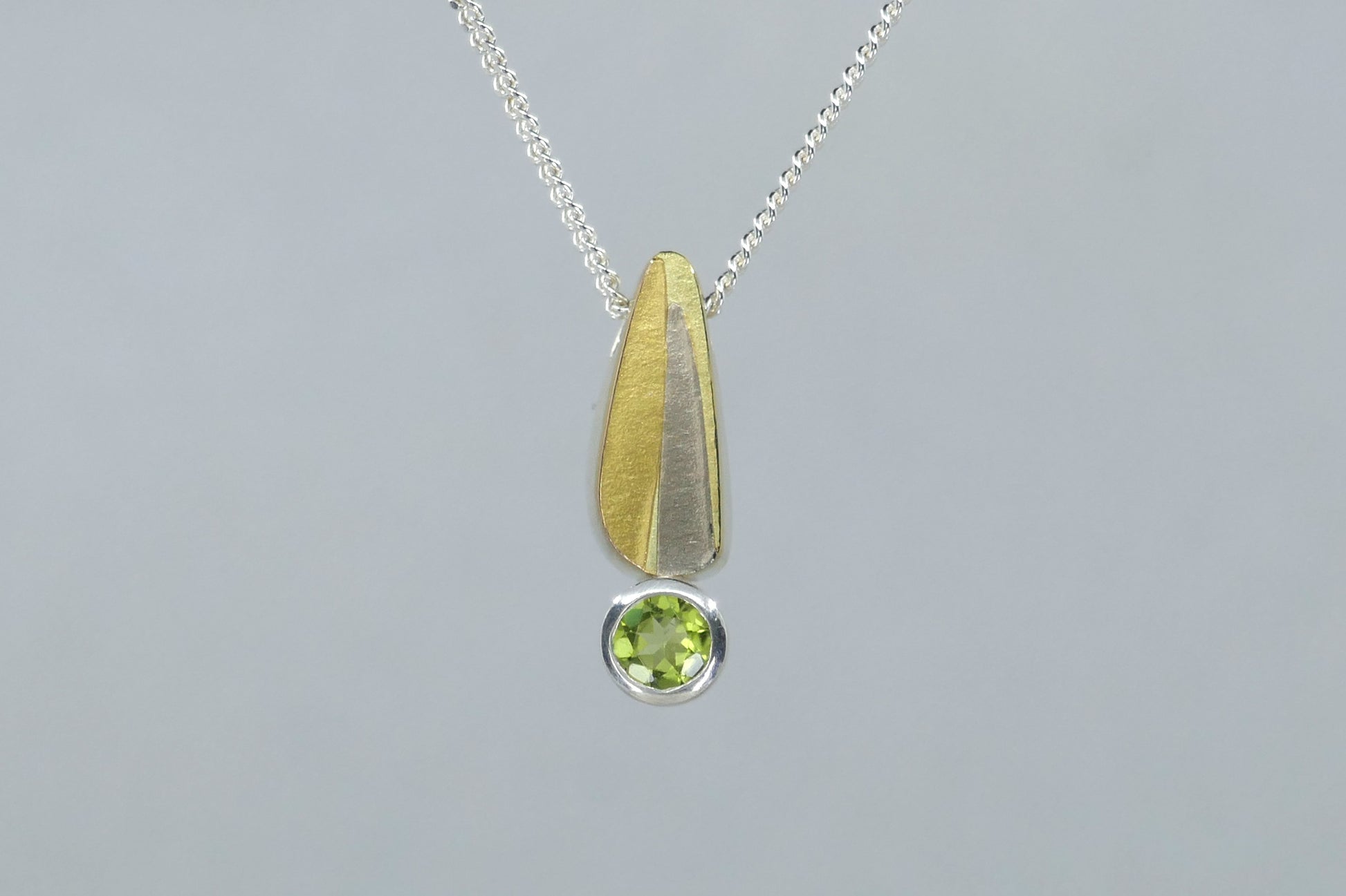 A unique handmade leaf design peridot silver necklace with 18ct coloured gold details.